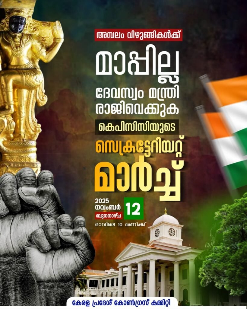 ദേവസ്വം മന്ത്രി രാജിവെക്കണമെന്ന ആവശ്യം; കെ.പി.സി.സി. നാളെ സെക്രട്ടേറിയറ്റ് മാര്ച്ച് നടത്തും