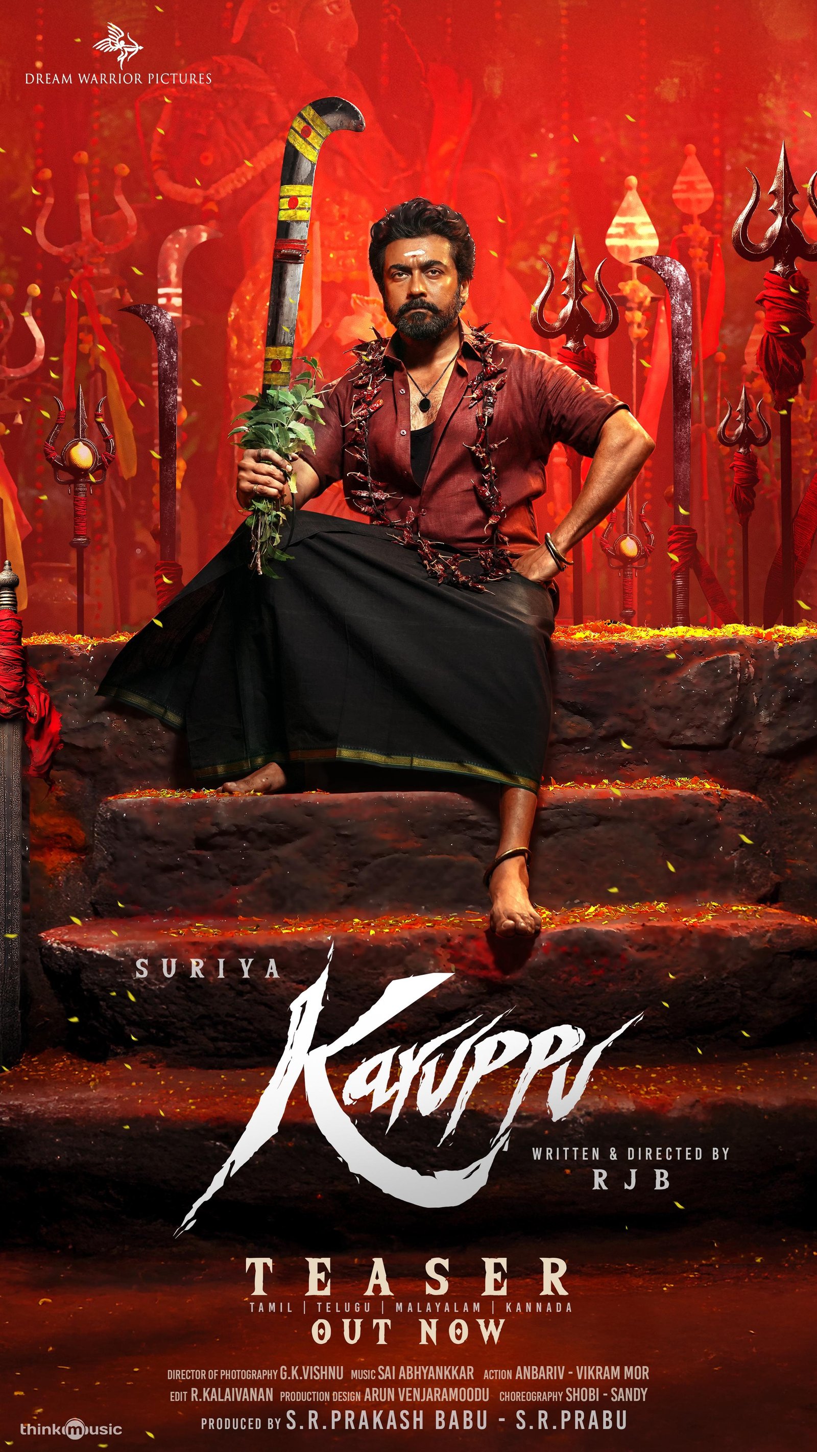 ഡ്രീം വാരിയര് പിക്ചേഴ്സിന്റെ നിര്മ്മാണത്തില് ഒരുങ്ങുന്ന ബിഗ് ബഡ്ജറ്റ് ചിത്രം കറുപ്പില് സൂര്യയുടെ കഥാപാത്രം തീവ്രത, ധൈര്യം, സമാനതകളില്ലാത്ത സ്ക്രീന് സാന്നിധ്യം എന്നിവയാല് നിറഞ്ഞിരിക്കുന്നു. ഒരു മിനിറ്റും മുപ്പത്തിയെട്ടു സെക്കന്ഡും ദൈര്ഘ്യമുള്ള ടീസര്, തീക്ഷ്ണമായ ദൃശ്യങ്ങളുടെയും, ആരാധകര്ക്ക് ആര്പ്പു വിളിക്കാന് സാധിക്കുന്ന നിമിഷങ്ങളും സമ്മാനിക്കുന്നു.