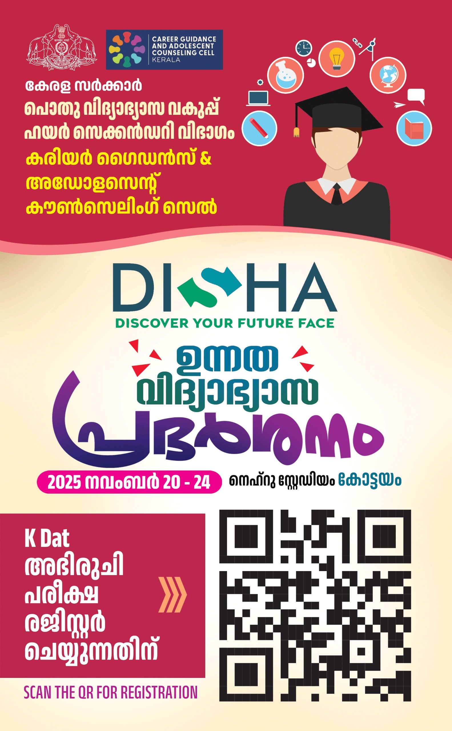 കോട്ടയം: കേരള സർക്കാർ പൊതു വിദ്യാഭ്യാസ വകുപ്പ് ഹയർ സെക്കൻഡറി വിഭാഗം കരിയർ ഗൈഡൻസ് & അഡോളസെൻ്റ് കൗൺസിലിംഗ് സെല്ലിൻ്റെ ആഭിമുഖ്യത്തിൽ ‘ദിശ’ എന്ന പേരിൽ ഉന്നത വിദ്യാഭ്യാസ പ്രദർശനം സംഘടിപ്പിക്കുന്നു. 2025 നവംബർ 20 മുതൽ 24 വരെ കോട്ടയത്തെ നെയ്റ്റിംഗ് സ്റ്റേഡിയത്തിലാണ് പ്രദർശനം നടക്കുക. കരിയർ സെമിനാറുകൾ, കേന്ദ്ര-സംസ്ഥാന സർക്കാരുകളുടെ പ്രമുഖ വിദ്യാഭ്യാസ സ്ഥാപനങ്ങളുടെ സ്റ്റാളുകൾ, കരിയർ കൗൺസിലിംഗ് എന്നിവ പ്രദർശനത്തിൻ്റെ പ്രധാന ആകർഷണങ്ങളാണ്. ഇതിനോടനുബന്ധിച്ച് അഭിരുചി പരീക്ഷയും നടത്തുന്നുണ്ട്. ഈ പ്രദർശനത്തിലേക്കുള്ള പ്രവേശനം […]