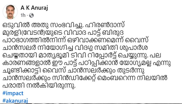 റാപ് ജനപ്രിയ സംഗീതമായി അംഗീകരിക്കാന്‍ കഴിയില്ലെന്ന് ചൂണ്ടിക്കാട്ടിയാണ് വേടന്റെ പാട്ട് പിന്‍വലിക്കാന്‍ ശുപാര്‍ശ ചെയ്തിരിക്കുന്നത്. റാപ്പിന്റെ സാഹിത്യത്തിന് ആശയപരമായ ഇഴയടുപ്പമില്ലെന്നും എം.എം. ബഷീറിന്റെ റിപ്പോര്‍ട്ടില്‍ പറയുന്നു. ഗൗരി ലക്ഷ്മിയുടെ ‘അജിതാ ഹരേ’ എന്ന പാട്ട് കഥകളി സംഗീതവുമായി താരതമ്യപഠനം നടത്താനാണ് നിര്‍ദേശിച്ചിരിക്കുന്നത്. ബിഎ മലയാളം പഠിക്കാന്‍ എത്തുന്ന വിദ്യാര്‍ഥികള്‍ക്ക് ഇതിന്റെ അടിസ്ഥാന കാര്യങ്ങളില്‍ പോലും ധാരണയുണ്ടാവില്ലെന്നും ഇത്തരം താരതമ്യപഠനം കഠിനമായിരിക്കുമെന്നും ചൂണ്ടിക്കാട്ടിയാണ് പാട്ട് പിന്‍വലിക്കാന്‍ ശുപാര്‍ശ നല്‍കിയത്.
